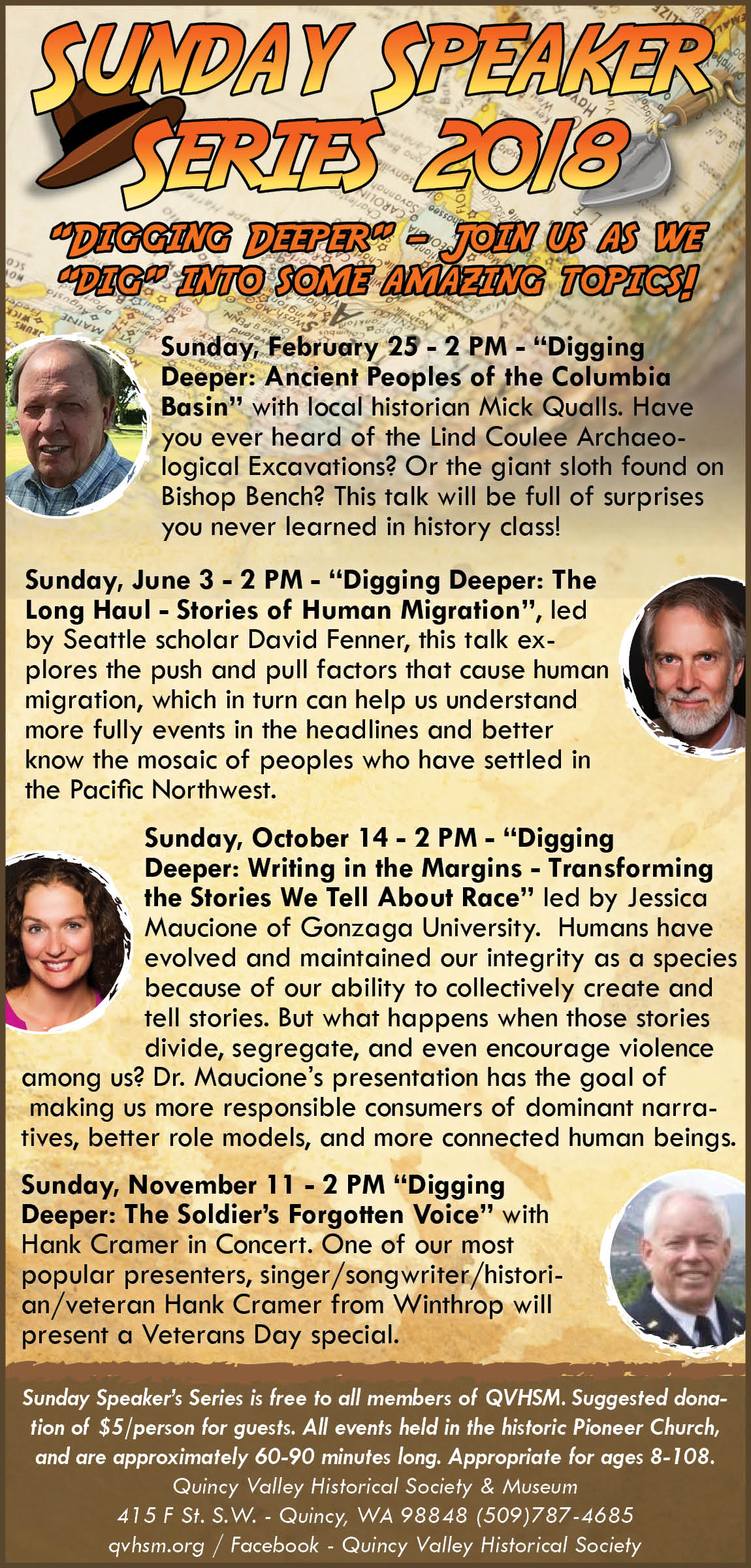 We are also indebted to Humanities Washington for providing some of our speakers each year. This is a free, granted program of our state and we are able to access presenters from all over Washington due to the generosity of this program. These are free to all. We participate in shared hosting with the Quincy Valley Public Library for speakers each year as well.